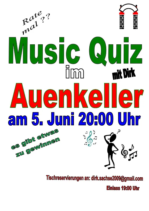 Am 05. Juni ab 20:00 Uhr, Einlass 19:00 Uhr, gibt es wieder ein Musik-Quiz. Musik und gute Laune wieder zum Nachdenken. Anmeldungen an dirk.sachse2009@mail.com .