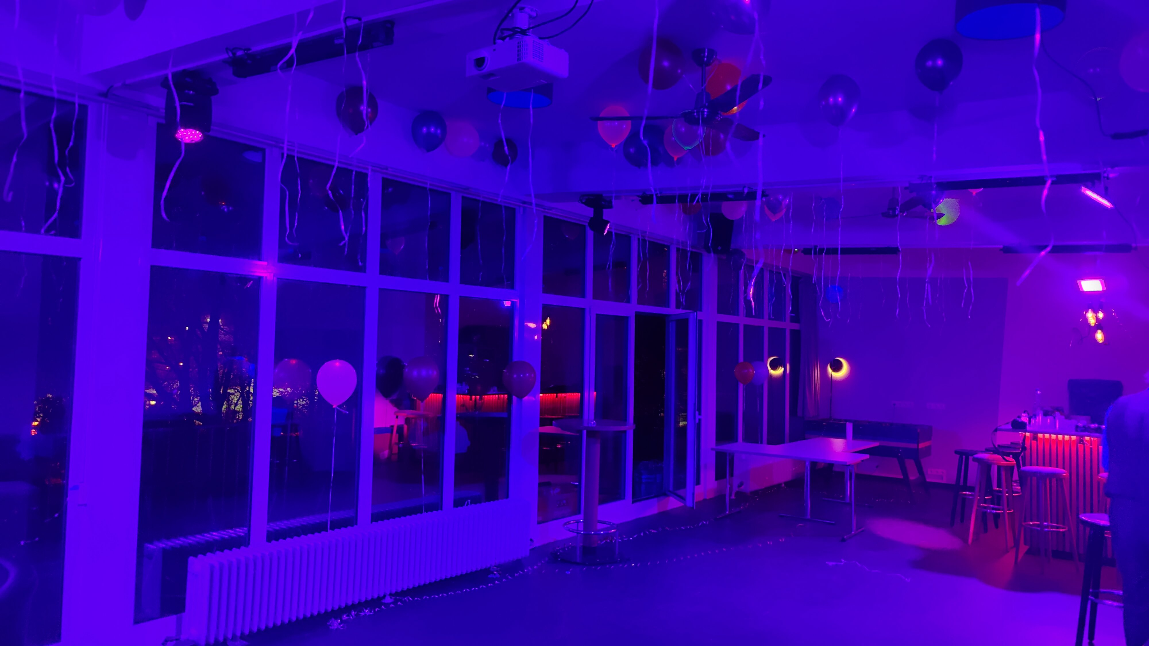Technische Ausstattung auf hohem Niveau: steuerbare LED-Bars und Moving Heads, Soundanlage (für Playlist oder DJ), Filmtechnik